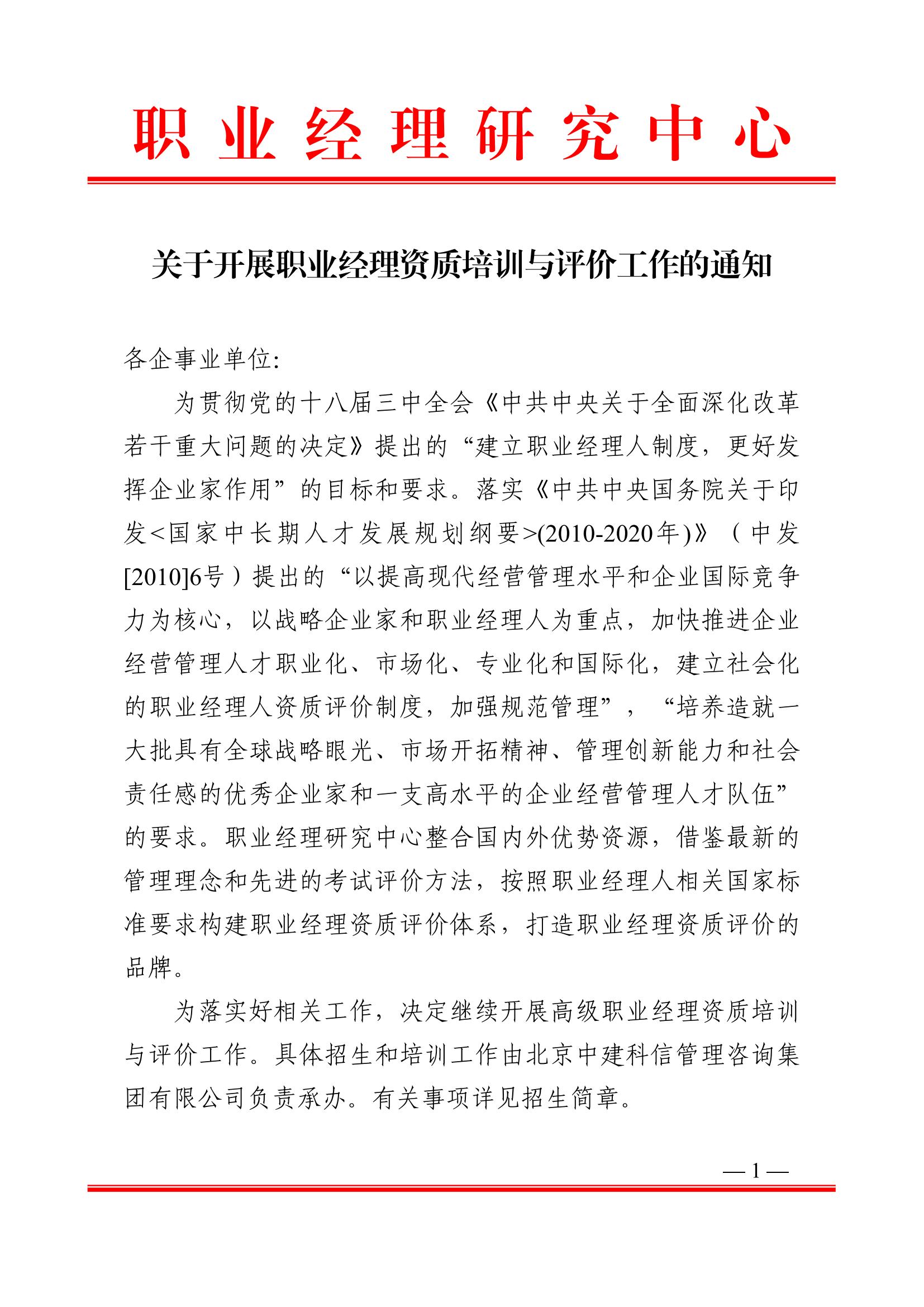 关于开展职业经理资质培训与评价工作的通知
