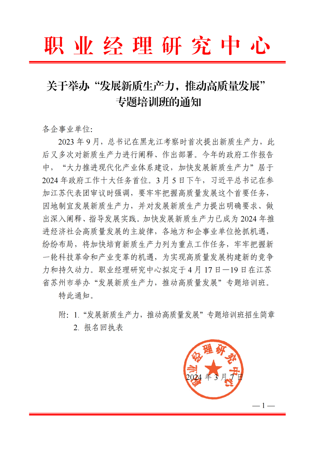 关于举办“发展新质生产力,推动高质量发展”专题培训班的通知