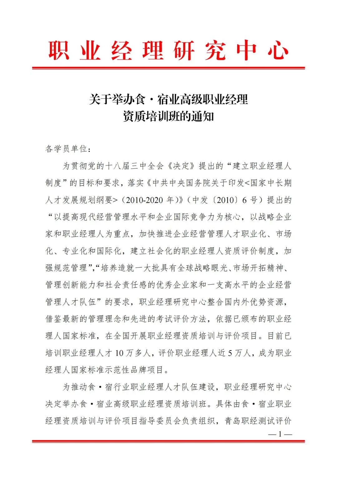 关于举办食·宿业高级职业经理资质培训班的通知